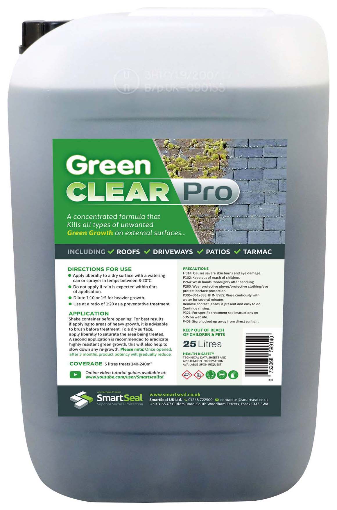 SmartSeal Green Clear PRO Moss & Algae Remover - 25L - Smartseal Green Clear PRO is a powerful, highly effective, microbiological biocide, that, once applied, will quickly start to rid the area of most types of green organic growth on external hard surfaces. This easy-to-apply formulation is suitable for controlling and removing organic growth, algae, mould and the various types of lichen that are often found on driveways, patios, roofs, walls and paths. It can also be reapplied at any time to help prevent the reappearance of these various species of organic growth and keep external hard surfaces looking clean at all times. Green Clear PRO is perfectly suited for the DIY market and can easily be applied with a watering can or sprayer.