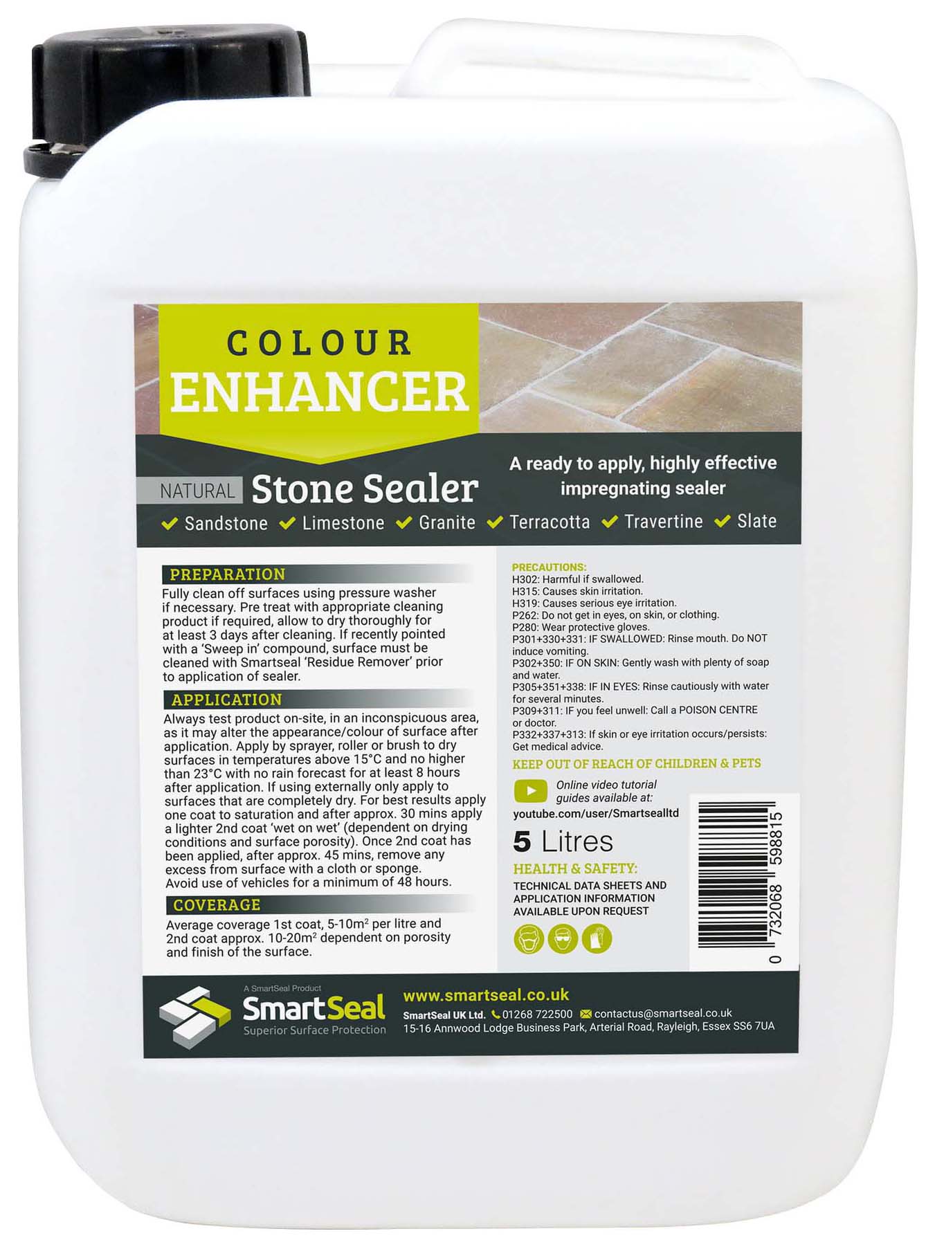 SmartSeal Natural Stone Sealer Colour Enhancer - 5L - Smartseal Natural Stone Sealer is a high quality, clear, solvent free acrylic impregnating coating system. Application of the sealer will alter the chemical structure of the porous natural stone providing a excellent water repellent and stain resistant surface.