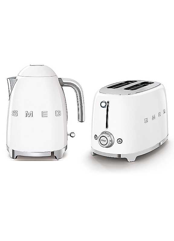 Whether you're preparing breakfast before the school run, or a luxurious breakfast in bed, the Smeg retro breakfast set has got it covered.Enjoy your breakfast in style with this elegantly designed two slice toaster. The quality drawn sheet steel construction is complimented by a retro design that really adds elegance to your kitchen countertop. This toaster features two extra wide slots that are big enough for nice thick slices of bread and bagels with a bagel function to give you the best results. The flashy illuminated dials provide up to six different browning levels to get your toast at the ideal texture for delicious results. It's all about functionality with this toaster, featuring defrost and reheat functions, you can quickly toast straight from frozen in a matter of minutes. The removable touch-release stainless steel crumb tray makes it easy to dispose of the excess crumbs. This two slice toaster also includes built-in cord storage to keep your kitchen countertops neat and tidy, while the anti-slip feet keeps it stable and comfortably in place.This 50's style red Smeg kettle has the capacity of 1.7 litres and opens gently with a light touch. The swivel base allows the kettle to rotate around 360° for easy handling and accessibility. Inside the kettle is a stainless-steel lime scale filter which can be removed for cleaning easily. The kettle has a safety cut off in the absence of water. The window on the side of the kettle allows the water level to always be monitored.REMOVABLE TOUCH-RELEASE: stainless steel crumb tray makes quick and easy work of disposing all of those excess crumbsSTAINLESS STEEL BODY WITH 360 SWIVEL BASE: 3Kw - 1.7 litre capacity - boils up to 7 cups at onceELEGANTLY DEEP DRAWN SHEET STEEL TWO SLICE TOASTER: featuring a retro design and extra wide slots for nice thick slices of bread and bagelsFLASHY ILLUMINATED DIALS: offer up to six varying browning levels to get the toast at the ideal texture for the most delicious results; also includes a bagel functionSMEG GUARANTEE: This product comes with a 2 year guarantee when you register for free with SMEG where you'll be able to return the appliance to be repaired or replaced if faulty Kettle dimensions approx. H24.8 x W22.6 x D17.1 cmToaster dimensions approx. H19.8 x W31 x D19.5 cm