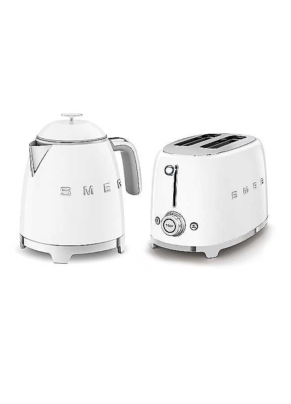 With a capacity of 0.8 litres, Smeg's Mini kettle makes up to 3 cups of tea or coffee. The smaller capacity minimises any water waste. The spout has been specially designed with a balanced weight for an easy pour and the lid has been built to manually open at an angle of 80 degrees for easy filling.Whether you're preparing breakfast before the school run, or a luxurious breakfast in bed, the Smeg two slot toaster has got it covered. This two slice toaster is perfect those who like to make a statement in the kitchen, but can also handle warming pastries, bagels, and toasting treats!Brand: SMEGA STYLISH LITTLE KETTLE: With 1400 watts power & a capacity of 0.8 litres/3 cups, the Smeg mini kettle minimises water wastageMULTI-FUNCTION CONTROL: Reheat to heat toast or slices of bread, Defrost to unfreeze frozen slices of bread or Bagel to brown just one side of the bread without toasting the otherEASY TO USE: The kettle can slot onto the 360 degree base in any position, making it perfect for right or left handed useLARGE COMPARTMENTS: Self-centering racks in the compartments ensure even toasting of slices of bread, whatever size they may beSMEG GUARANTEE: This product comes with a 2 year guarantee when you register for free with SMEG where you'll be able to return the appliance to be repaired or replaced if faultyPower: Kettle 1400WToaster 950WCable length - 1mKettle features - Auto switch off, integrated cord, anti-slip feet, 360 swivel baseToaster features - x6 toasting levels, reheat function, defrost function, bagel function, crumb tray, anti-slip feet, integrated cordKettle dimensions approx. H20 x W20 x D15.2 cmToaster dimensions approx. H19.8 x W31 x D19.5 cm