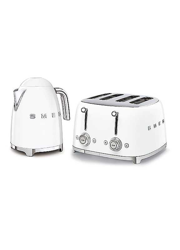 Smeg's iconic retro design offers a pop of colour and a premium enamelled finish, excl. handle. With a generous capacity of 1.7 litres, Smeg's KLF03 kettle makes up to 7 cups of tea or coffee. The spout has been specially designed with a balanced weight for an easy pour. The elegant soft opening lid not only looks beautiful but allows for easy filling and ensures that any condensation runs back into the kettle.Whether your preparing fragrant, buttery croissants for two, or a family sized breakfast before the school run, the Smeg TSF03 4 slot toaster has got it covered. This toaster allows up to 4 slices to be cooked at the same time making it ideal for large families, or those who like the start the day with a hearty breakfast for plenty of energy!Brand: SMEGELEGANT SOFT OPENING: The kettles lid is soft opening when the central button is pressed for easy fillingLARGE COMPARTMENTS: Self-centering racks in the compartments ensure even toasting of slices of bread, whatever size they may beEXCELLENT HEAT CONDUCTION: The kettles enamelled stainless steel surface ensures excellent heat conduction & there is an automatic switch off at 100°C for added piece of mind4 LARGE SLOTS: With its powerful 2000W operation, the TSF03 toaster also boasts two independent control panels & 4 spacious slots (36 mm each) with slice centring featurePower: Kettle 3000WToaster 2000WCable length - 1mKettle capacity - 1.7L (7cups)Kettle features - Auto switch off, integrated cord, anti-slip feet, 360 swivel base, limescale filterToaster features - x6 toasting levels, reheat function, defrost function, bagel function, crumb tray, anti-slip feet, integrated cordKettle dimensions approx. H24.8 x W22.6 x D17.1 cmToaster dimensions approx. H19.8 x W30 x D33 cm