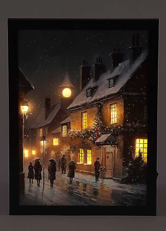 This battery operated 30x40cm LED Framed Canvas Winter Street features a beautifully illustrated winter street scene, set in a sleek black frame 2.5cm deep. It is illuminated by subtle LED lights, and also features a convenient vibration switch for easy activation. Perfect for adding a cosy, festive touch to your space.Battery operatedRequires 3 x AA batteries (not included)Dimensions approx. 30 x 40 cm | canvas wall art, christmas scene, lighted wall hanging