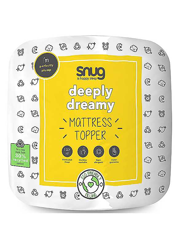 Kick back and relax with the Snug deeply dreamy mattress topper, helping you to sleep happy. The mattress topper is covered in soft microfibre and filled with squidgy fibres that will leave you longing for your bed. Not only will it protect your mattress from wear and tear, but the topper also adds an extra lovely layer of comfort.We've got you; your bedding is filled with recycled materials giving our lovely planet a helping hand. We care so you can be carefree, the squidgy fibres were once plastic bottles that have experienced a wonderful makeover. Our packaging is made from 30% recycled materials and can be fully recycled.Here at Snug, we believe that everyone deserves a happy sleep! Made in UK HAPPY SLEEP: Made especially for sleepyheads, the Snug Deeply Dreamy mattress topper offers oodles of comfort for a night full of sweet dreams TRANSFORMS YOUR BED: Adds extra comfort to your existing mattress ECO FRIENDLY: The Deeply Dreamy Mattress Topper is filled with 100% recycled materials & has helped to prevent up to 74 plastic bottles from going into the oceans or landfill RECYCLED PACKAGING: Snug packaging is made from 30% recycled materials & better still, its 100% recyclable; just pass it on to your local supermarket or recycling point VEGAN FRIENDLY & HYPOALLERGENIC: Cruelty-free & contains no animal derivatives Free from harmful chemicals & materials that may cause pesky allergies or skin irritation MACHINE WASHABLE: Snug products are made right here in the UK & are fully machine washable & this mattress topper comes complete with a no-worries 2-year manufacturer's guarantee Machine washable Tumble dry low 100% Microfibre Filling: Hollowfibre