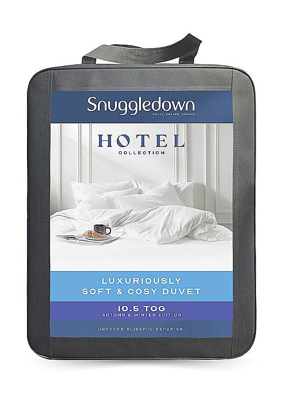 Luxuriously soft and lofty with a natural drape, this luxurious hotel 10.5 tog all year round duvet from Snuggledown is wonderfully light. Made in the UK to exacting standards, this premium duvet combines quality and functionality so that you can enjoy an unsurpassed night's sleep whilst wrapped in hotel quality luxury. The duvet is filled with a soft and cosy hollowfibre which beautifully balances warmth and weight, and being a mid-weight 10.5 tog duvet, it's a great option for use all year round.10.5 TogHotel quality luxuryMachine washable Tumble dryCover & Filling: 100% Polyester