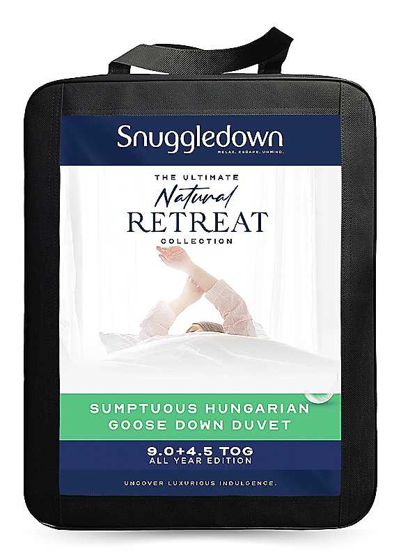 Designed to offer you a 3 in 1 solution for all seasons. Our 4.5 Tog keeps you cool over the summer months while our 9 Tog is perfect for keeping you warmer on cooler nights. Both duvets can be fastened together to give you extra warmth on the chilliest of winter nights, keeping you extra toastySnuggledown Duvet Features: Cover: 100% Cotton Filling: 80% Hungarian goose down, 20% Hungarian goose feather