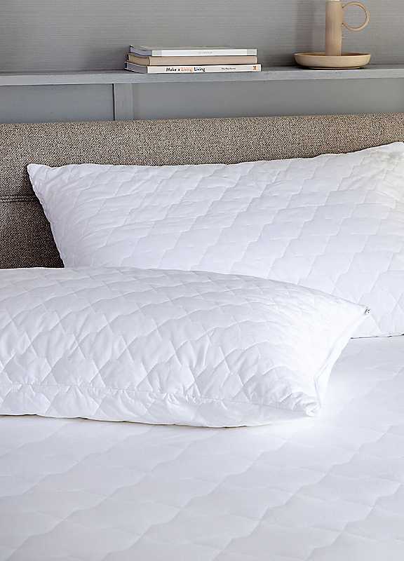 Pillow and mattress protectors aren't the first thing you'd associate with luxury. But these protectors are different. Not only will they keep your bedding hygienically clean but they'll also add a generous touch of additional comfort with a quilted finish. Their breathable nature makes these pillow protectors the ideal complement to our natural-fill and feather & down pillows.Machine washable at 40°C (Or at 30°C for a greener way to stay clean)Tumble dry on low until completely dryDo not dry cleanTop: 100% CottonReverse: 100% Polyester