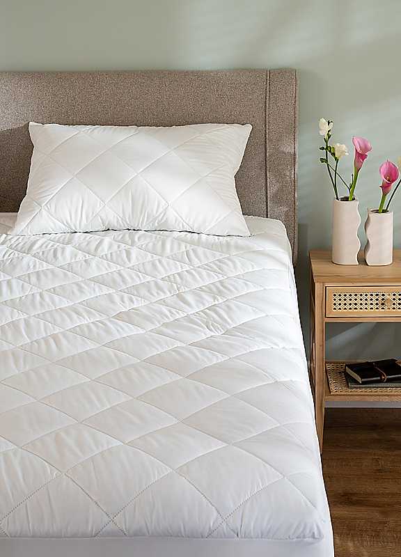 An effective protector at a very attractive price. It protects from excess moisture, dust and dirt, and is covered with soft microfibre fabric for extra comfort.Dry completely before use.Attaches to your mattress with an elasticated jersey skirt.Wash at max 40, every 3-4 weeks.100% Polyester fill and casing.