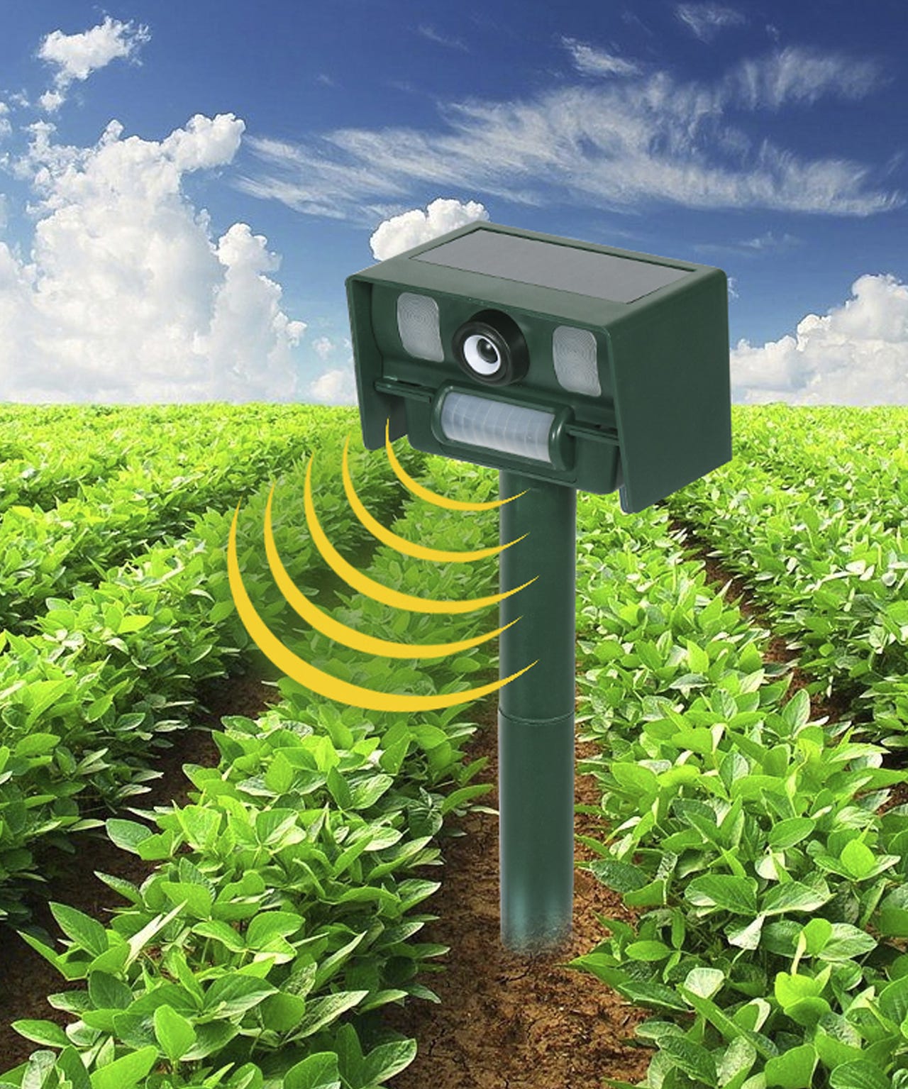 Deter cats, dogs, rodents, foxes and more from your garden with this easy-to-install animal repeller. Powered by the sun, it has a detection range of 7 metres - with two sonic wave settings and a flashing light. Requires 4 x rechargeable AA batteries (included). Size: 10x12x9cm approx. Stake length: 26.5cm approx.