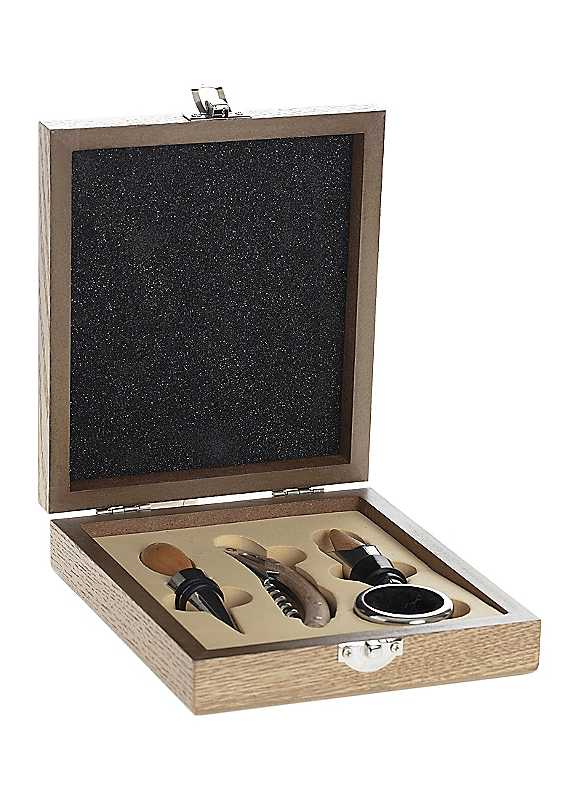 Calling all wine enthusiasts and aspiring connoisseurs! Elevate your wine experience with our premium Sommelier Kit. Crafted to perfection, this kit is your ticket to mastering the art of wine tasting and appreciation. Includes corkscrew, stopper, pourer and neck ring.Hand washWoodDimensions approx. 4.2H x 17.8L x 4.2D cm