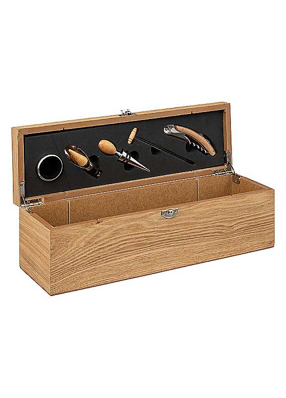 Calling all wine enthusiasts and aspiring connoisseurs! Elevate your wine experience with our premium Sommelier Kit. Crafted to perfection, this kit is your ticket to mastering the art of wine tasting and appreciation. Includes corkscrew, stopper, pourer, neck ring and thermometer. Plus cradle for a preferred bottle of your choice makes this an ideal gift!Hand washWoodDimensions approx. 10.9H x 35.8L x 12D cm