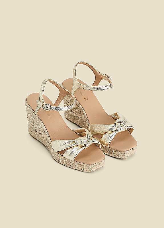 Sosandar Gold Leather Knot Detail Wedge Espadrille Sandals