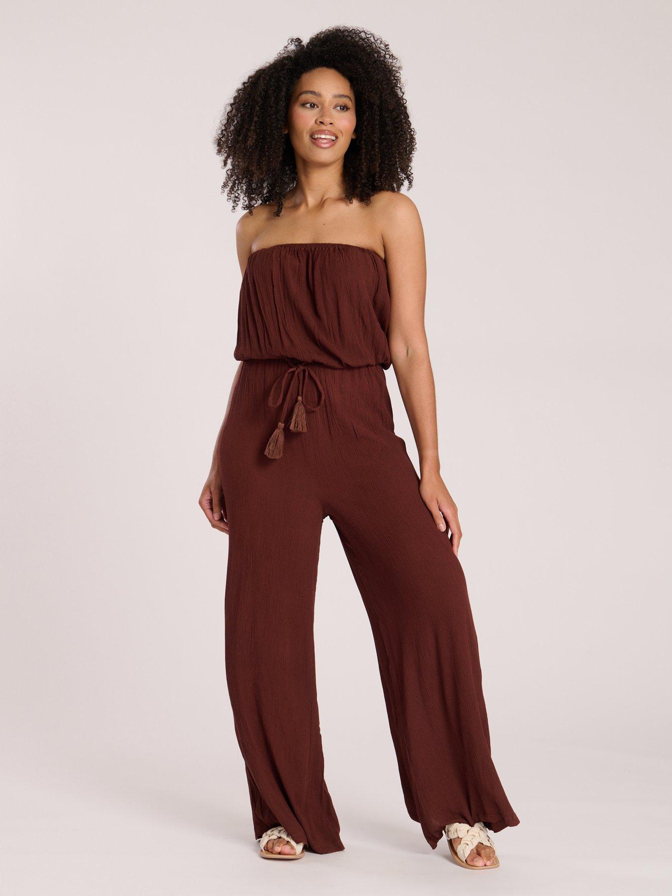South Beach Crinkle Viscose Strapless Jumpsuit - Brown - Size 12 - Women