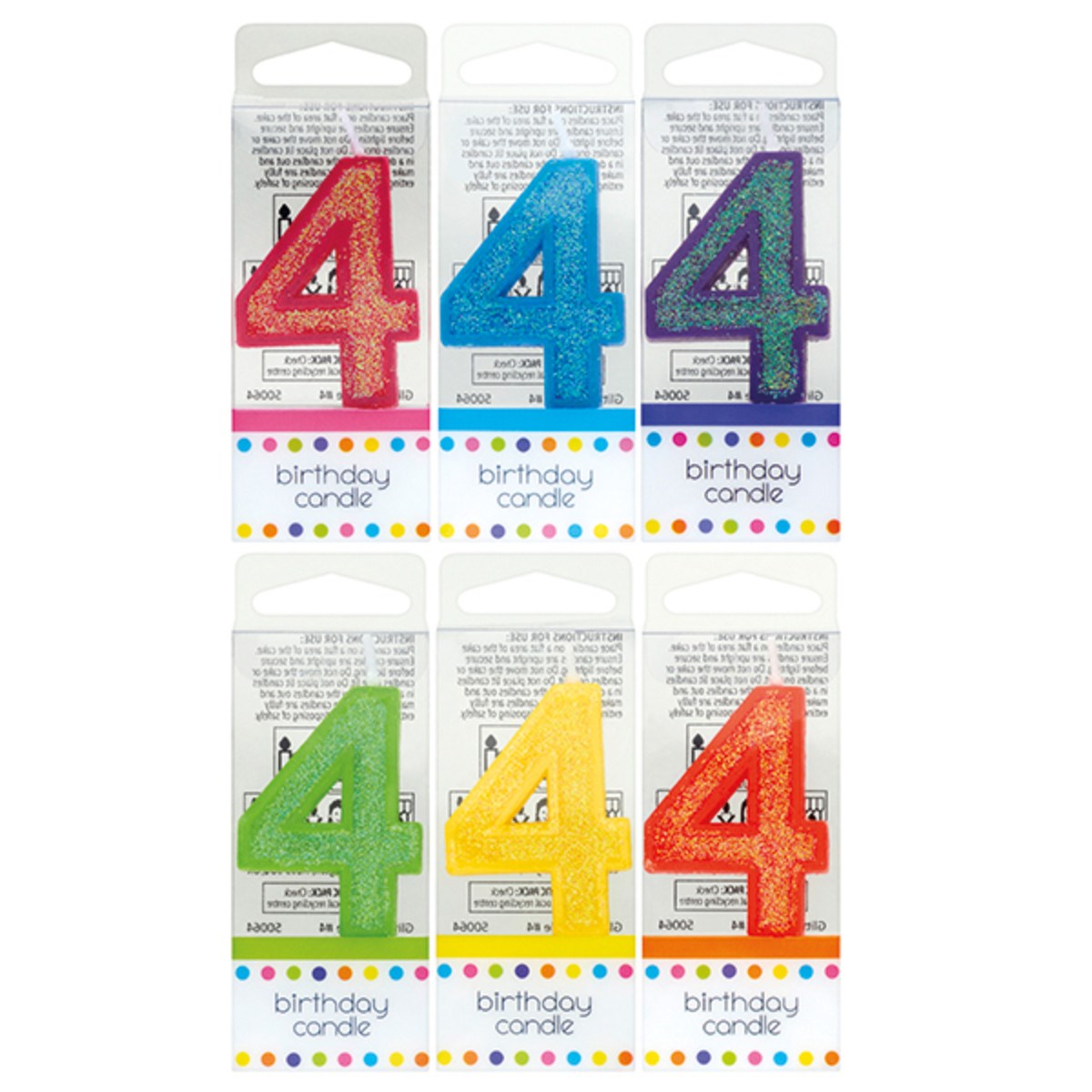Celebrate birthdays in style with these Sparkly Number Candles in 4, in Pink, Purple, Yellow, Orange, Green and Blue; a colour for any theme.