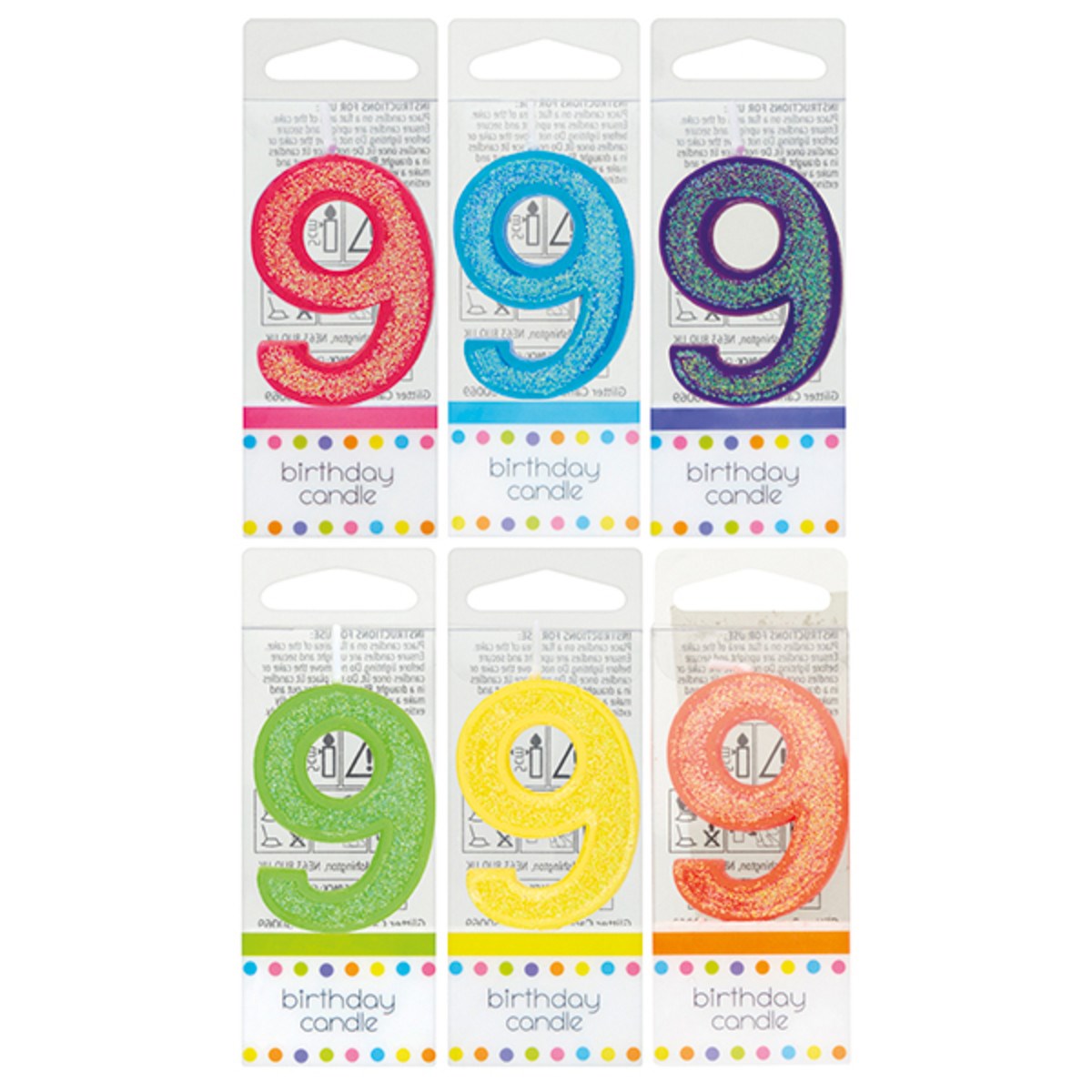 Celebrate birthdays in style with these Sparkly Number Candles in 9, in Pink, Purple, Yellow, Orange, Green and Blue; a colour for any theme.