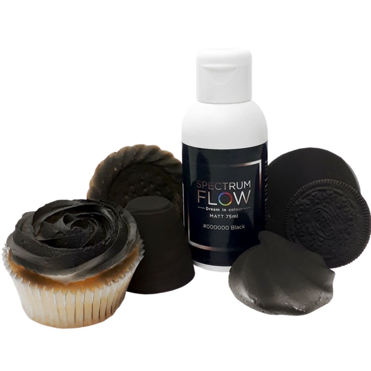 This matt black Spectrum Flow airbrush paint can be used with any airbrush to achieve a clean and consistent matt finish on sugar pastes, modelling pastes, buttercream and even chocolate.