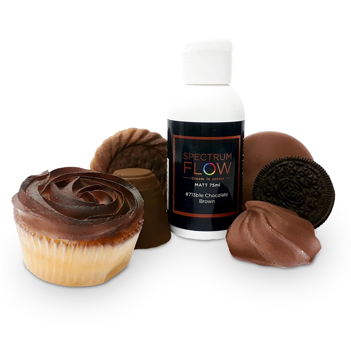 This matt brown Spectrum Flow airbrush paint can be used with any airbrush to achieve a clean and consistent matt finish on sugar pastes, modelling pastes, buttercream and even chocolate.