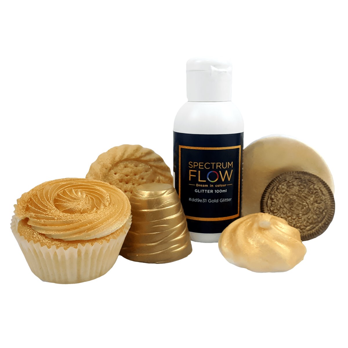 This gold glitter Spectrum Flow airbrush paint can be used with any airbrush to achieve a shimmering pearlescent finish on sugar pastes, modelling pastes, buttercream and even chocolate.