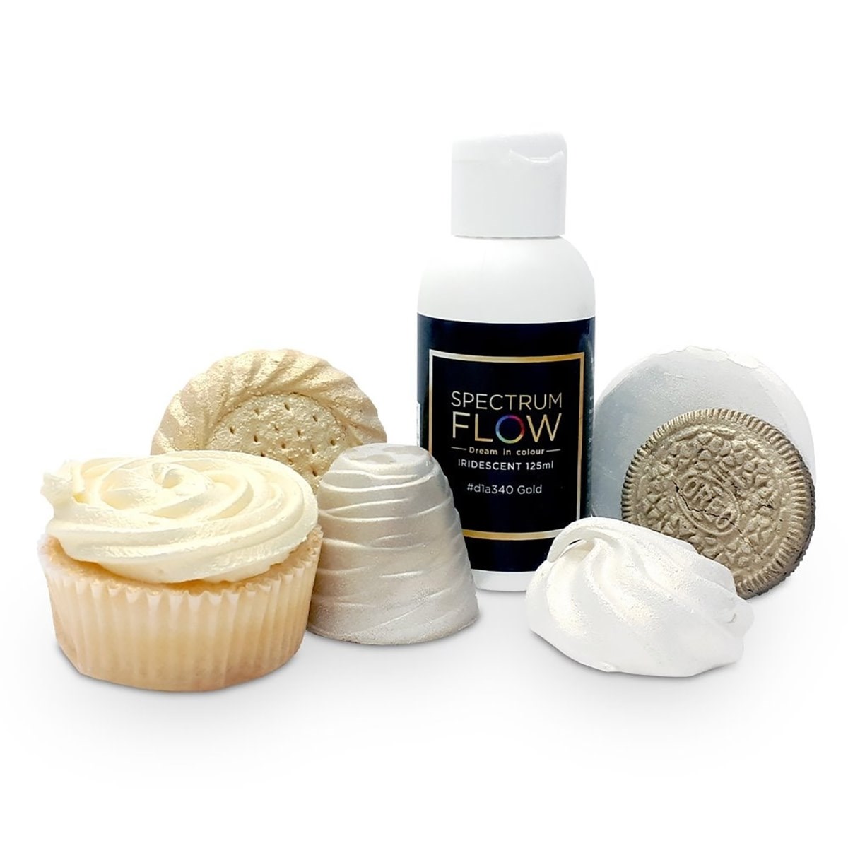 This metallic gold Spectrum Flow airbrush paint can be used with any airbrush to achieve a shimmering iridescent finish on sugar pastes, modelling pastes, buttercream and even chocolate.