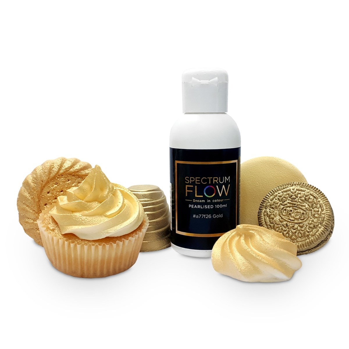This pearl gold Spectrum Flow airbrush paint can be used with any airbrush to achieve a shimmering pearlescent finish on sugar pastes, modelling pastes, buttercream and even chocolate.