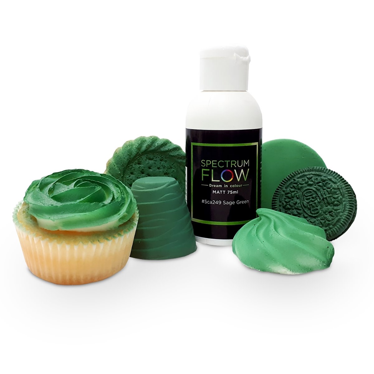 This matt green Spectrum Flow airbrush paint can be used with any airbrush to achieve a clean and consistent matt finish on sugar pastes, modelling pastes, buttercream and even chocolate.