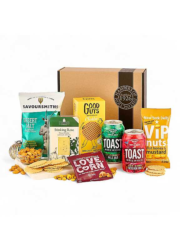 Raise a glass to indulgence with our Beer & Cheese Hamper, the ultimate gift for beer enthusiasts and cheese lovers alike. Beautifully presented in a stylish kraft gift box, this hamper is packed with premium delights that make it a standout choice for birthdays, Father's Day, or any special occasion. At the heart of this collection are two exceptional craft beers:Toast New Dawn Session IPA (330ml) - a refreshing, citrus-led beer with a crisp, lively finish, perfect for an afternoon toast or relaxing with friends.Toast Grassroots Pale Ale (330ml) - a perfectly balanced pale ale, combining hoppy brightness with gentle malt sweetness for a classic, satisfying flavour. No beer experience is complete without cheese, and this hamper includes Croome Cheese Stinking Rose Mature Cheddar with Garlic & Parsley. Rich, full-flavoured, and infused with aromatic garlic and fresh parsley, it pairs beautifully with the beers and elevates any tasting experience. To complement the drinks and cheese, enjoy a carefully curated selection of gourmet snacks:Savoursmith Desert Salt & Vinegar Crisps - tangy, crisp, and addictiveLove Corn Smoked BBQ - smoky, sweet, and satisfyingly crunchyVIP Nuts Hot Honey & Mustard - a punchy blend of sweet and spicy for adventurous palatesGood Guys Cheddar Biscuit Melts - soft, cheesy, and indulgent Together, these treats create a balanced and flavourful experience, perfect for sharing-or enjoying solo. Whether it's a birthday, Father's Day, or simply a way to show someone you care, the Beer & Cheese Hamper delivers the perfect combination of craft beer, bold cheese, and gourmet snacks-making every occasion a little more celebratory. Toast New Dawn Session IPA 330ml Age suitability: 18 years+ Toast Grassroots Pale Ale 330ml Croome Cheese Stinking Rose Mature Cheddar with Garlic & Parsley 150g VIP Nuts Hot Honey & Mustard 63g Savoursmith Desert Salt & Vinegar 40g Good Guys Cheddar Biscuit Melts 50g Love Corn Smoked BBQ 20g Packed in Kraft Gift Box For ingredients information click here Drink Responsibly. Please note - Customers must be 18 or over to purchase this product.