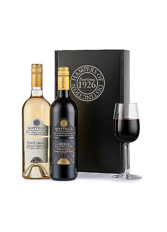 Discover the essence of Italy with the Italian Wine Duo, beautifully presented in a sleek black gift box. This refined collection features two exceptional wines from Bottega: the bold Cabernet Sauvignon and the crisp Pinot Grigio, offering a delightful contrast of flavours for any wine lover. The Bottega Cabernet Sauvignon is a classic red, known for its deep, robust character. Rich notes of blackcurrant and dark cherry are complemented by a subtle hint of vanilla, with well-structured tannins and a lingering finish. Perfect for pairing with hearty dishes or enjoying on its own, it delivers the full-bodied indulgence that red wine enthusiasts crave. The Bottega Pinot Grigio offers a crisp and refreshing white experience, celebrated for its light, zesty profile. Vibrant notes of green apple, pear, and a touch of citrus provide a clean, balanced finish, making it an ideal partner for seafood, fresh salads, or light pasta dishes. Elegant, versatile, and indulgent, the Italian Wine Duo is a sophisticated gift for wine enthusiasts, celebrations, or those simply wishing to enjoy a taste of Italy at home. Whether marking a special occasion or adding a touch of elegance to an evening, this hamper showcases the very best of Italian winemaking. Bottega Cabernet Sauvignon 75cl Age suitability: 18 years+ Bottega Pinot Grigio 75cl Packed in a Black Gift Box Drink Responsibly. Please note - Customers must be 18 or over to purchase this product. For ingredients information click here