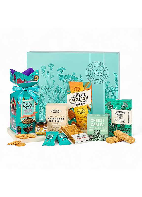 Indulge yourself or delight someone special with the Tea & Treats Gift Box, a carefully curated collection of sweet and savoury treats, perfectly paired with fine English tea. Presented in an elegant wicker-look gift box, this hamper adds sophistication to any occasion - ideal for birthdays, thank-you gestures, or a cosy afternoon tea at home. At the heart of the hamper is Cartwright & Butler English Afternoon Tea, a classic, smooth, and aromatic blend, perfect for sipping any time of day. Complementing the tea is a tempting selection of indulgences: Monty Bojangles Flutter Scotch Truffles, dusted in cocoa and infused with butterscotch, offer a luxuriously rich bite. For lovers of baked treats, enjoy the Yorkshire Flapjack Raspberry & White Chocolate, combining fruity sweetness with creamy chocolate, and Shortbread House Stem Ginger Shortbread, delivering a buttery crunch with a warming ginger twist. The Ultimate English Salted Caramel Fudge melts in the mouth, while Bramble Apricot Preserve spreads a touch of sunshine onto scones or toast. To balance the sweetness, the Pea Green Boat Cheese Sables with Nigella Seeds & Chive add a sophisticated savoury note, creating a harmonious mix of flavours and textures that will delight every palate. Whether enjoyed solo or shared with friends and family, the Tea & Treats Gift Box offers a refined, memorable tea-time experience that's as beautiful to give as it is to receive. Monty Bojangles Flutter Scotch Gift Box 150g Yorkshire Flapjack Raspberry & White Chocolate Flapjack 90g Shortbread House Shortbread with Stem Ginger 170g Cartwright & Butler English Afternoon Tea 10 Bags 30g Ultimate English Salted Caramel Fudge 150g Bramble Apricot Preserve 42g Pea Green Boat Cheese Sables with Nigella Seeds & Chive 35g Packed in a Wicker Look Gift Box For ingredients information click here