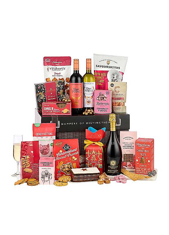The ultimate Christmas Eve indulgence, The Excelsior is a generous hamper designed to bring family and friends together as the festive celebrations begin. Presented in an elegant wicker-look gift box, it offers a luxurious selection of sweet and savoury treats, complemented by three bottles of exceptional wine and sparkling Prosecco - the perfect way to toast the season. For the adults, enjoy the rich, full-bodied Domaine Boyar Deer Point Cabernet Sauvignon, the crisp freshness of Sauvignon Blanc, or the celebratory sparkle of Casa Bottega Prosecco. Each wine pairs beautifully with the carefully selected savoury nibbles:Buiteman Cheddar Biscuits - crisp, cheesy, and indulgent.Tomato & Basil Seeded Flatbreads - aromatic, flavourful, and lightly savoury.Wagyu Beef Crisps - bold, meaty, and satisfying.Teriyaki Mochi Rice Bites - sweet-savoury bites with an Asian twist. Sweet treats bring festive cheer for all ages:Brandy-Rich Mince Pies - spiced, traditional, and golden.Caramelised Biscuit Crumb Popcorn - crunchy, buttery, and indulgent.Monty Bojangles Truffles - rich, chocolatey, and decadent.Strawbellini Fudge - fruity, sweet, and creamy.Gingerbread Christmas Trees & Mixed Berry Oaties - whimsical and festive.Iced Fruit Cake - beautifully baked, rich, and celebratory. Playful extras for everyone include wild strawberry sweets and baked sweet chilli peanuts & cashews, ensuring there's something to delight every palate. Brimming with variety, luxury, and festive charm, The Excelsior is more than just a hamper - it's a celebration in a box, perfect for making Christmas Eve unforgettable. Designed for sharing, toasting, and creating joyful memories, it brings together indulgence, elegance, and the magic of the season in every bite and sip. Domaine Boyar Deer Point Cabernet Sauvignon 75cl Buttermilk Strawbellini Fudge 100g Age suitability: 18 years+ Hawken's Gingerbread Christmas Trees 125g Domaine Boyar Deer Point Sauvignon Blanc 75cl Anna's Ginger Thins 150g Casa Bottega Prosecco DOC 75cl Hebridean Baker Mixed Berry Oaties 150g Grandma Wild's 4 Traditional Mince Pies Filbert's Teriyaki Mochi Rice Bites 150g Love Popcorn Caramelised Biscuit Crumb 100g Original Cake Co. Iced Fruit Cake Monty Bojangles Party Truffle Collection 130g Candy Kittens Wild Strawberry Sweets 140g Buiteman Cheddar Biscuits 75g Packed in Wicker Look Gift Box Cartwright & Butler Tomato & Basil Seeded Flatbreads 130g Savoursmith Wagyu Beef with Honey & Mustard 150g For ingredients information click here Drink Responsibly. Please note - Customers must be 18 or over to purchase this product.