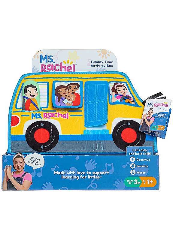 Sing 'Wheels on the Bus' as you and baby explore the Ms. Rachel Tummy Time Activity Bus. This soft toy playset is designed to promote sensory, cognitive, and motor development. Have baby move the boy up and down, swish the ribbon 'wipers', look at the baby-safe mirror and delight in the high-contrast black-and-white graphics for visual engagement. The Ms. Rachel Tummy Time Activity Bus toy is made to support learning for little ones and help develop muscle strength during tummy time. An included bonus learning card features extra play tips and skill-building activities. Ms. Rachel is a real teacher and passionate educator, with two masters degrees in education - who creates research-based videos and products to support learning for little ones. Plush toys can be a child's very first pretend play friend and are important developmental toys for infants and babies of all ages, stages, and learning abilities.Age suitability: 1+ Years