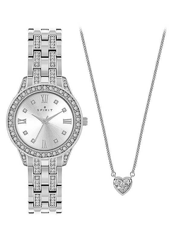Step into fashionable elegance with our stunning gift set. The watch has stone-set bezel and double row of stones on the bracelet exuding glamour. The sunray dial with Roman numerals adds a classic touch. Paired with a beautiful necklace featuring a sparkly heart-shaped stone, creating an irresistible combination for someone you love...Or an indulgent treat for yourself!Brand: SpiritDouble Layered DialSword Hands Pointed Tip | stone watches, roman numeral watches, silver metal strap watch, ladies bling watches, round dial watches, silver wrist watch, ladies silver watch, ladies analogue watch, watch and bracelet set