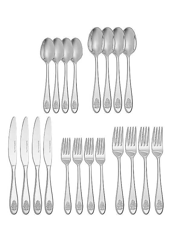 The Spode Christmas Tree 20-piece flatware set is crafted of durable 18/10 stainless steel and features an embossed Christmas Tree motif on each handle. This set is dishwasher-safe, and includes 4 of each: dinner fork, salad fork, dinner knife, tablespoon, and teaspoon. A perfect touch of holiday to any dinnerware collection.Dishwasher safeDinner knife dimensions approx. 0.87H x 2.2W x 24.3L cmDessert spoon dimensions approx. 2.4H x 4.22W x 21.1L cmDinner fork dimensions approx. 2.52H x 2.8W x 21.57L cmSalad fork dimensions approx. 2.25H x 2.45W x 18.9L cmTea spoon dimensions approx. (US): 2.1H x 3.7W x 18.6L cm