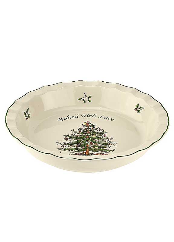 Bake the most delicious pie with this Christmas Tree Pie Dish. Not only will this piece bake a perfect pastry-topped pie it also looks great on the table. Guests will love the spectacle of placing a steaming pie in the centre of a table and as the pie is eaten, the sentiment of 'baked with love' will be displayed alongside Spode's striking Christmas Tree design. Once everyone has enjoyed eating the pie, place it in the dishwasher to clean. It makes the ideal gift for the baker in the family.Dishwasher, microwave, freezer & oven safeDimensions approx. 25.3H x 25.3W x 4.5D cm