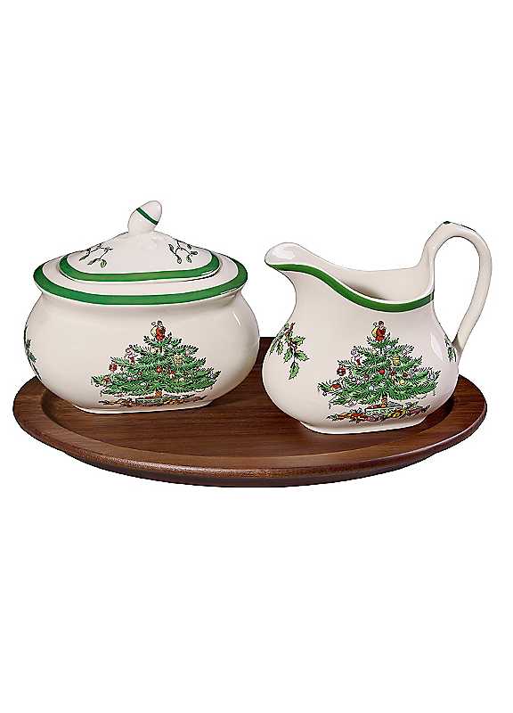 Spode's Christmas Tree collection was created in 1938 and has since become one of the world's most loved festive tableware designs. Loved for its nostalgia and warm recollections of Christmases past, this unique range adds distinctive charm to the season--celebrating traditions and creating memories. Our Christmas Tree Sugar and Creamer sit beautifully on this acacia wood tray. Bring this teatime trio to the table or give as a special gift.Sugar: 500ml, Creamer: 300mlMicrowave & dishwasher safeSugar dimensions approx. 11H x 14W x 11D cmCreamer dimensions approx. 11H x 12.5W x 8D cm
