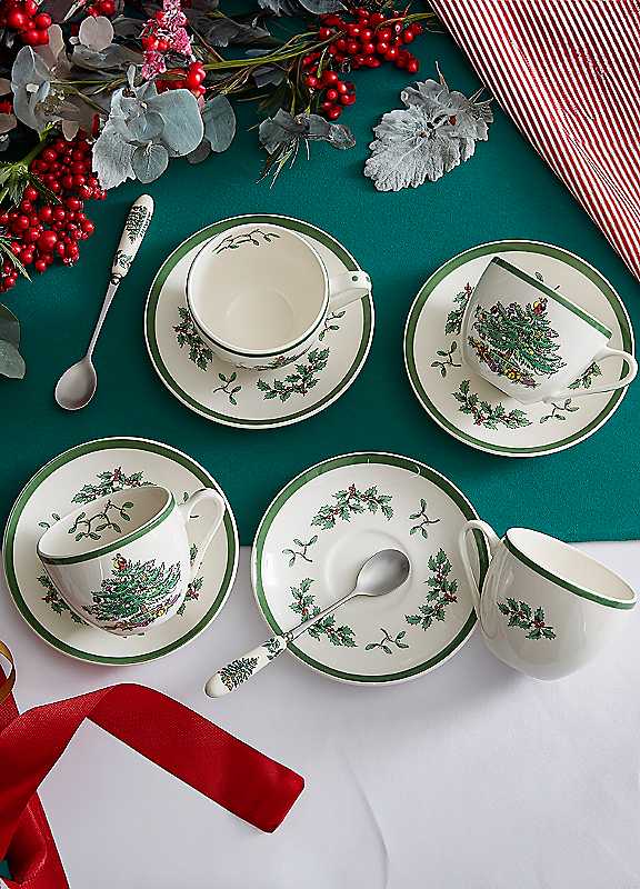 Gather the family and enjoy a festive cup of tea and cake with this set of four Christmas Tree Teacup and Saucers. Made in England, each cup features the iconic Spode design while the saucers are decorated with a sprig of holly and mistletoe to complete the look. Microwave and dishwasher safe.Microwave and dishwasher safeEarthenwareDimensions approx. 14.3D x 14.3 C 7.2H cm
