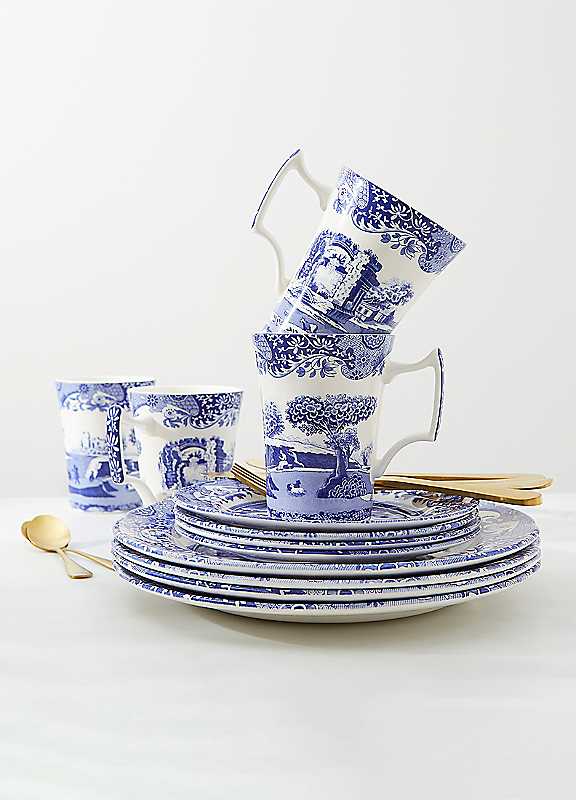 A stunning addition to your dining room, this tableware set oozes heritage style. Featuring dinner plates, side plates and mugs, it provides the perfect canvas for Spode's iconic Blue Italian design, which dates back to 1816. The pattern's hallmark cobalt hues are integral to each item, forming beguiling shapes and landscapes. Everywhere you look across the set there is a fascinating detail to feast your eyes upon.Earthenware, Microwave, Dishwasher, Freezer & Oven safeDinner plates (27 cm), Side plates size approx. 4 x 19 cm, Mugs size approx. 4 x 0.28l