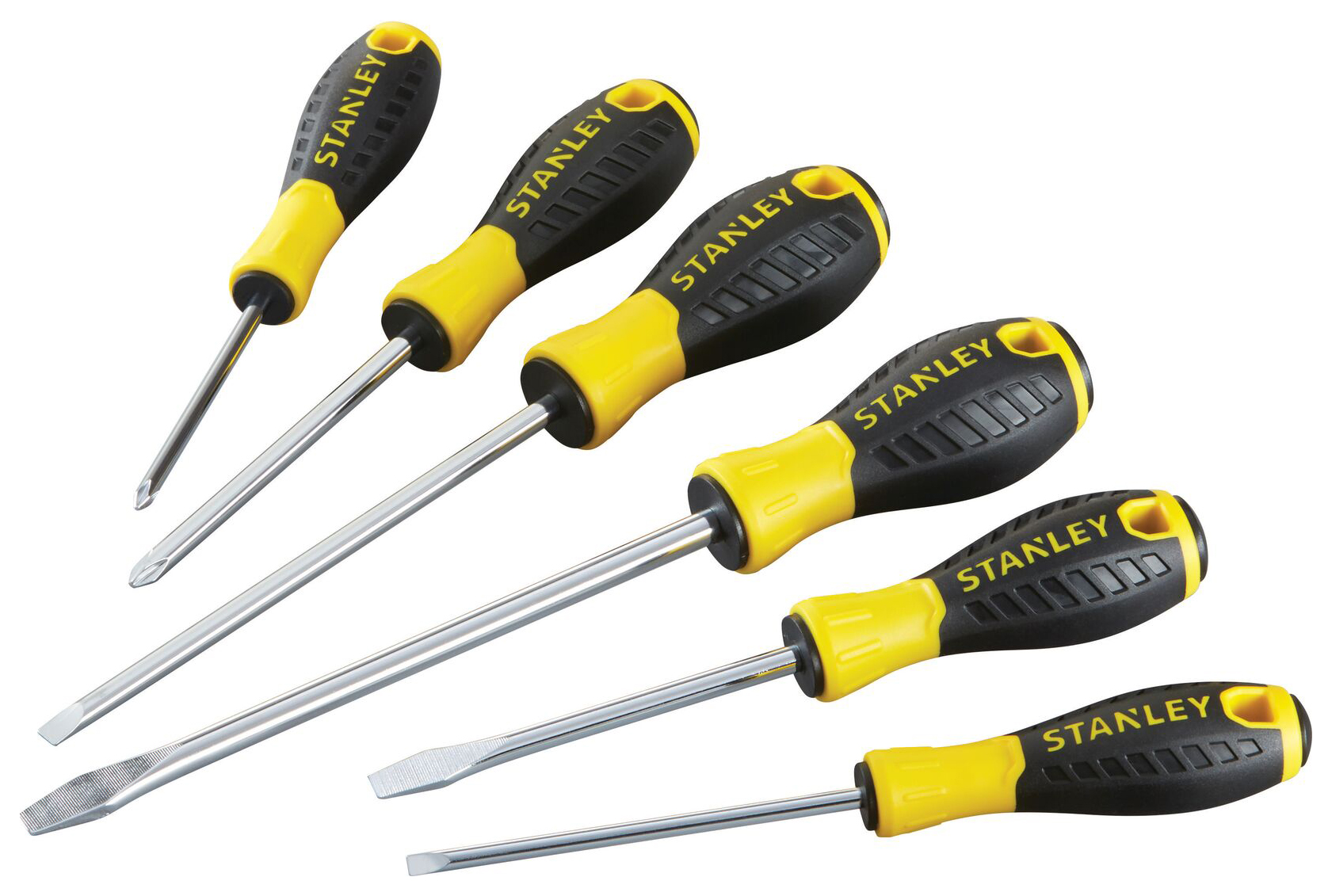 Stanley® Essential Large Tip Screwdriver 6 Piece Set - Combining everyday reliability with exceptional value, the Stanley® Essential Large Tip Screwdriver Set is built for consistent performance on a wide range of tasks. Each screwdriver features a soft, textured handle for enhanced comfort and grip, even during extended use. Crafted with durable chrome vanadium steel bars, these tools offer excellent strength and corrosion resistance, while the hardened tips ensure long-lasting precision. A rotating turning head on each handle allows for controlled, detailed work, ideal for DIYers and professionals alike.