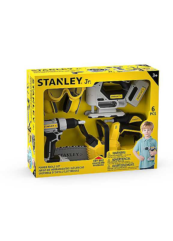 Stanley Jr. Power Tool Set, 6 pc set contains goggles, ear defenders, drill, screw driver, chainsaw and a jigsaw perfect for any child to enjoy helping out with DIY. With realistic sounds, power trigger, real action and LED lights.