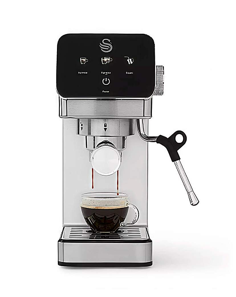 The Swan Mini Digital Espresso Coffee Machine brings a sleek, premium design to your kitchen collection and cafe quality drinks to the comfort of your home, all packed into a conveniently compact design that takes up to 35 percent less worktop space. Get accurate coffee levels using the included spoon, with the tamper accessory evenly packing your coffee grounds. Then use the intuitive touch screen display to choose from 3 pre set options to enjoy an Espresso, Double Espresso or perfectly frothed Steam, giving you the barista experience with just one touch. If you're a coffee aficionado seeking the best tasting coffee, this machine has a powerful 20 bar steam pressure system, delivering 33 percent improved extraction than a standard coffee machine's 15 bars. This extra pressure enhances flavour intensity and depth, resulting in a thicker, bolder, and richer espresso every time. The built in high pressure milk frother features variable steam settings to quickly heat up and froth your milk so it's silky smooth. You can create deliciously milky recipes, such as lattes, cappuccinos and hot chocolates. The 1.2 litre water tank makes up to 40 small espresso shots from one fill, great for entertaining. It also includes shot filters that can make up to two shots of espresso at once, letting you easily add extra strength to your coffee or make a drink for your loved one. It's easy to clean and maintain thanks to the removable drip tray. This coffee machine is the way your favourite drinks are meant to be enjoyed.