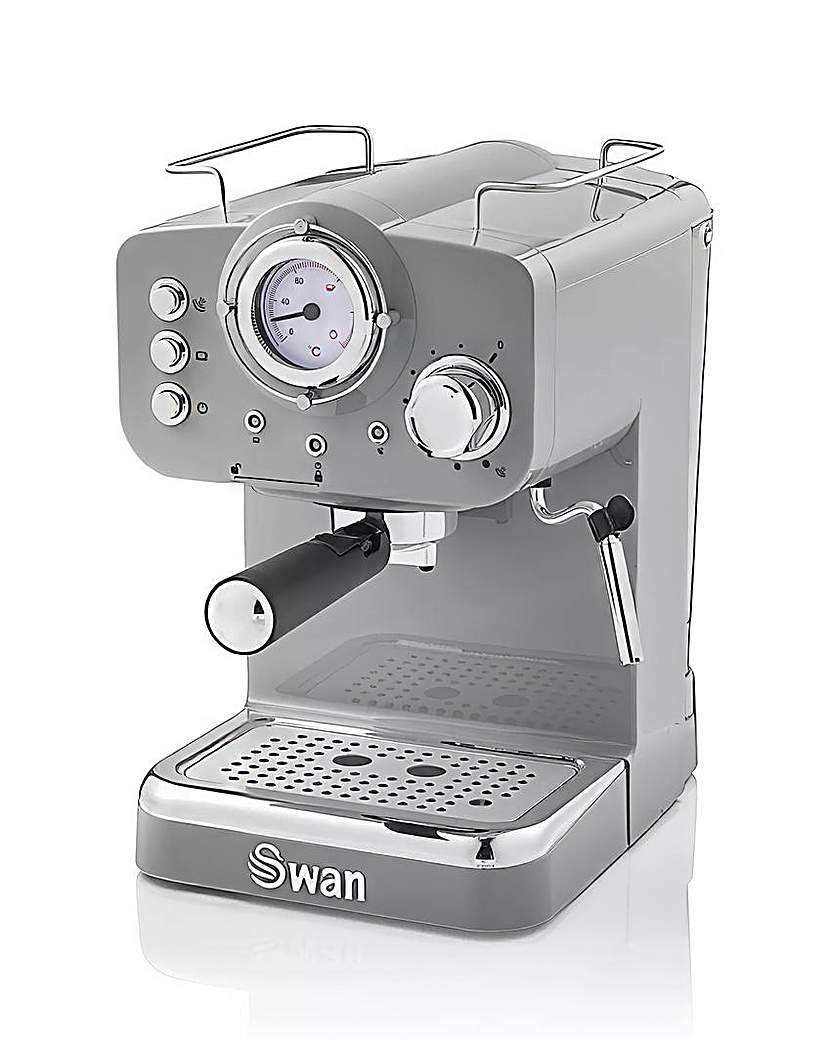 The Swan Digital Espresso Coffee Machine brings a sleek, premium design to your kitchen collection and cafe quality drinks to the comfort of your home. Get accurate coffee levels using the included spoon, with the tamper accessory evenly packing your coffee grounds. Then use the intuitive touch screen display to choose from 7 pre set options for an Espresso, Double Espresso, Cappuccino, Cappuccino Plus, Latte, Latte Plus and Hot Foam, giving you the barista experience with just one touch. There's also an additional Clean pre set where with just one touch, it easily cleans the milk frother to keep your drinks tasting fresh. If you're a coffee aficionado seeking the best tasting coffee, this machine has a powerful 20 bar steam pressure system, delivering 33 percent improved extraction than a standard coffee machines 15 bars. This extra pressure enhances flavour intensity and depth, resulting in a thicker, bolder, and richer espresso every time. The built in milk frother automatically dispenses frothy milk straight into your cup, so you can make the perfect silky smooth latte or cappuccino with one simple step. The large 1.6 litre water tank makes over 25 large espresso shots from one fill, great for entertaining. It also includes shot filters that can make up to two shots of espresso at once, letting you easily add extra strength to your coffee or make a drink for your loved one. It's also easy to clean and maintain thanks to the dual stainless steel filter. This coffee machine is the way your favourite drinks are meant to be enjoyed.