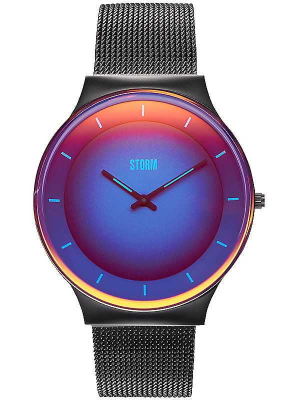 The Storm London Pylo is a sleek, ultra-slim timepiece designed with a striking edge-to-edge glass face. Its graduated dial, crafted with innovative photochromic glass, shifts through a spectrum of vivid colours depending on the angle of light. This effect is achieved using our advanced lazer glass technology, ensuring dynamic colour transitions under different lighting conditions. Complementing its modern aesthetic, the Pylo features a sophisticated mesh band and a matte black stainless steel finish, delivering a perfect blend of style and innovation.Slim watchThick edge to edge glassPhotochromic Glass | round dial watch, analog watch, steel watch bracelet, minimalist watch, quartz watch, casual watch, thin watch, blue steel watch