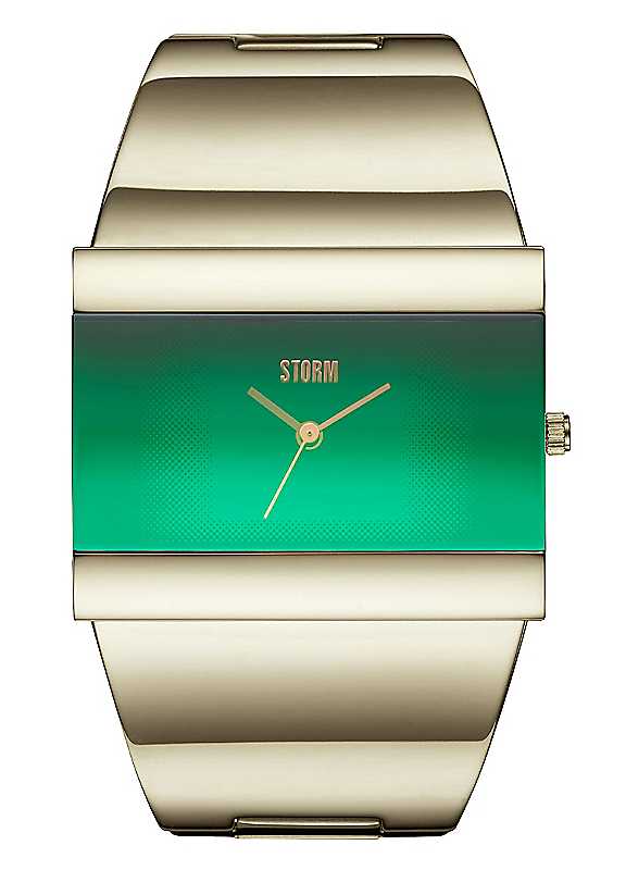 The STORM Starletti is a sleek watch with signature STORM style. The rectangular dial has lazer green coloured edge to edge glass and a smooth highly polished 21k gold-plated stainless steel strap which fits the wrist beautifully.Quartz Movement (Japanese)Stainless SteelSlim Watch21k Gold PlatingEdge to Edge GlassSignature Lazer Glass Materials Used | luxury quartz watch, casual watch, rectangle gold watch, luxury gold watch, gold plated watch, slim analog watch, stainless steel watch, gold analog watch, quartz wrist watch, ladies gold watch, gold green watch, gold watch strap