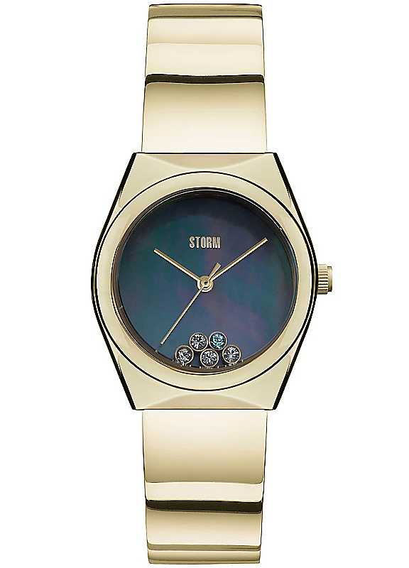 The Storm London Zinara is a sophisticated timepiece, featuring a black mother-of-pearl dial that subtly catches the light. Five floating crystals move freely across the dial, adding a refined touch. The highly polished stainless steel strap, finished with 21k gold plating, offers a contemporary yet timeless appeal, making it suitable for both day and evening wear. With water resistance up to 50 meters, the Zinara combines elegance and practicality, making it a versatile addition to any collection.Quartz movement (Japanese)Floating crystalsMother of pearl21k Gold platingHigh Grade Stainless Steel materials used | gold stainless steel watch, mother of pearl watch, casual wear watch, gold women's watch, crystal watch, small gold watch, round watch, metal strap watch, luxury watch, water resistant watch, watch bracelet gold, gold plated watch, black gold watch, quartz watch, analog watch black