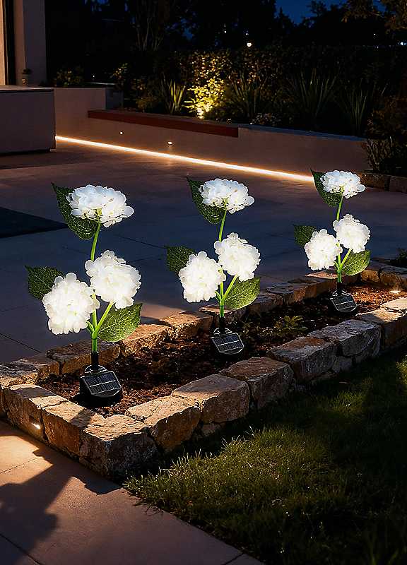 Bring Timeless Floral Charm to Your Garden - Transform your garden into a magical night-time retreat with the Streetwize Hydrangea Solar Lights. Designed to replicate the delicate beauty of blooming hydrangeas, these solar-powered stake lights offer a soft, warm glow that instantly enhances your outdoor decor. Perfect for lining garden paths, brightening patios, or adding ambience to flowerbeds, they combine elegance with effortless functionality.All-Night Illumination-Powered by a polycrystalline solar panel and a 1.2V 200mAh rechargeable battery, these lights charge automatically during the day and illuminate at dusk, providing up to 8 hours of enchanting light on a full charge.Natural Beauty Meets Durability-Each light features 30 warm white LEDs delicately woven through realistic flower clusters, creating a soft and inviting atmosphere. Built from durable, weather-resistant materials, they're designed to withstand the British weather season after season.Effortless Setup, Zero Running Costs - No wiring or mains electricity required - simply insert the stakes into the ground where they can receive ample sunlight. With an automatic on/off function, your garden lighting takes care of itself.Why You'll Love It- Adds elegance and colour to garden paths and flowerbeds- Solar powered for eco-friendly, cost-free operation- Weather-resistant and durable for year-round beauty- Easy installation - no tools or wiring needed- Automatic on/off light sensor for hands-free conveniencePack of 3LED Count: 30 Warm White LEDs per stakeBattery: 1.2V 200mAh Ni-MH rechargeableSolar Panel: PolycrystallineFunction: Steady-on illuminationMinimal assemblySolar light: YesBattery Included: YesHeight approx. 70 cm each