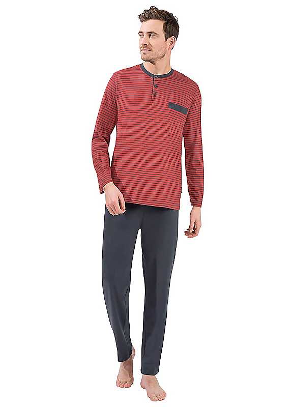 Single jersey fabric pyjamas made from pure cotton, with a high quality woven striped pattern. The long sleeve top features a short button panel on the rounded neckline, making it easier to get on and off. Featuring piping on the rounded neckline, buttons and chest pocket trim, which has contrasting colour accents. Comes with full length, plain bottoms with a fully elasticated waistband for total comfort. Washable max. 40°C 100% Cotton