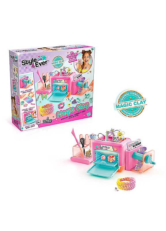 Create your own trendy rings, bracelets, pendants and more with the Style 4 Ever Magic Clay Jewellery Maker! This special quick-curing clay bakes in under 3 minutes using the kid-safe baking oven. Mix colours, shape your designs with the roller and tools, then add sparkle with gems! With a unique clay formula and enough materials to make Up to 20 stunning pieces, it's the ultimate DIY jewellery set for young creators.1 3-in-1 Jewellery maker5 Bags of magic clay6 Moulding tools2 Foil pots3 Decoration bags1 Decorative transfer sheet2 Beads bags2 Threads3 Tutorial sheets1 GuideAge Suitability: 6+ Years
