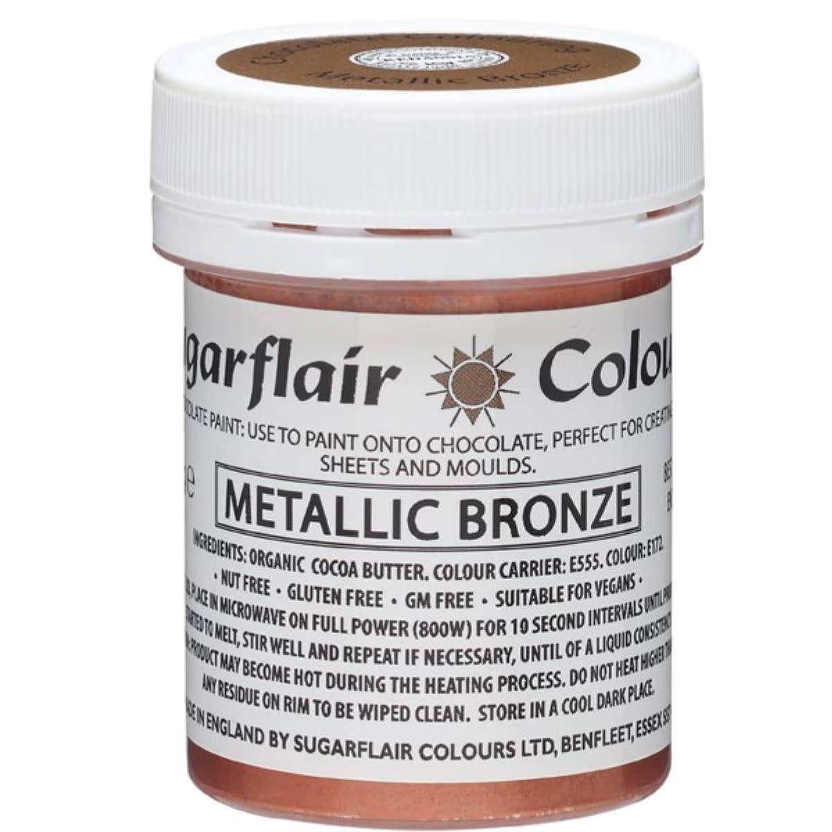 This Sugarflair Organic Cocoa Butter based chocolate colouring in metallic bronze is perfect for adding a professional colour to your chocolate work, to match any occasion or themed decoration.