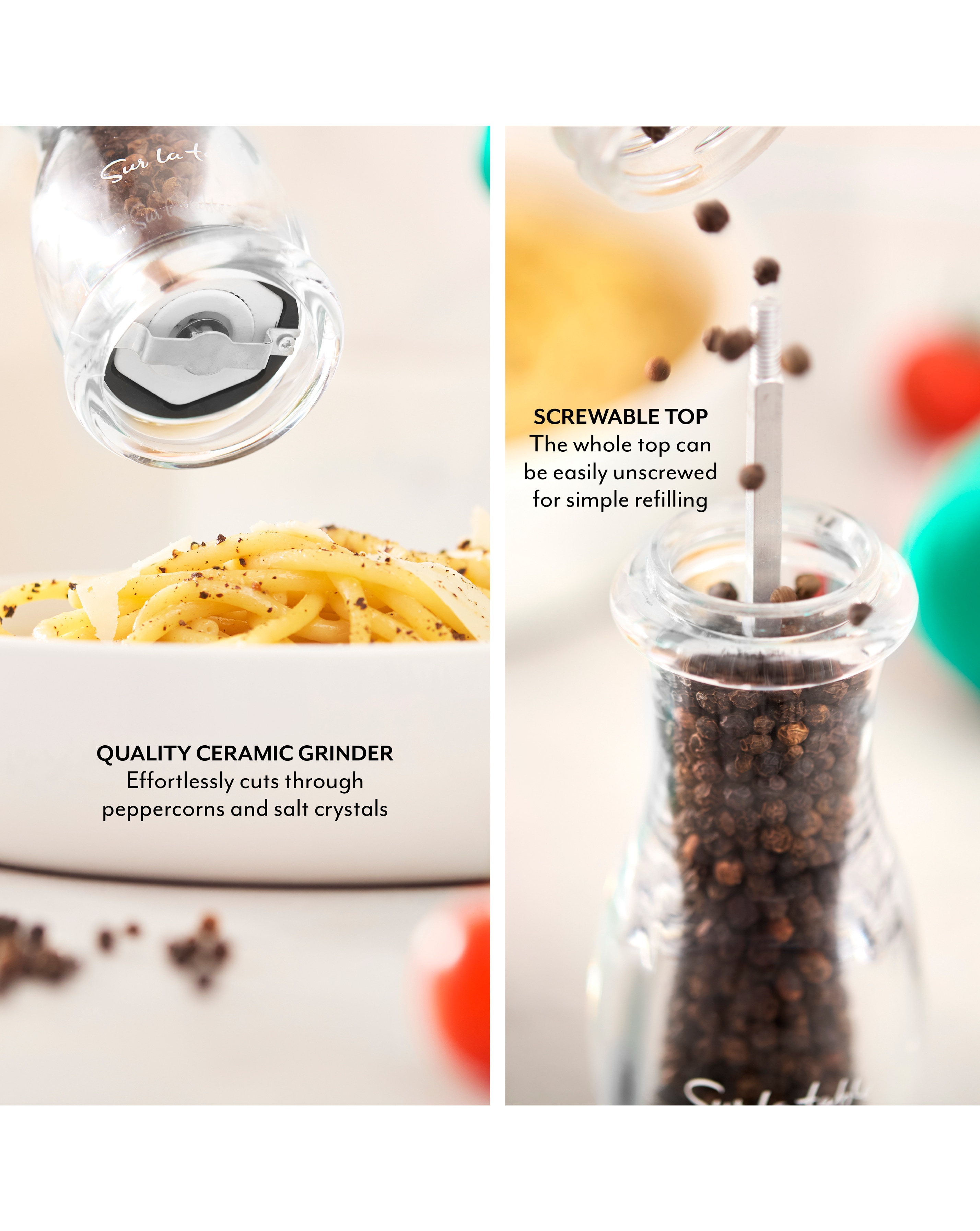 Looking to add extra flavour to your dishes? Our SLT847053GRN set of two manual salt and pepper mills is what every cook needs. They feature multiple grinding options for both coarse and fine. The grinder is made from durable ceramic, meaning it effortlessly cuts through peppercorns and salt crystals for perfect seasoning. Sur La Table, over 50 years of cooking together. SEASONED TO PERFECTION - Whether you need coarse salt and pepper for a more nuanced flavour in your casserole or a finer portion to season a dish at the dining room table, this mill has you covered. It features multiple grinding options for all uses. DESIGNED FOR CONVENIENCE - The tops of these salt and pepper mills are screwable so you can easily remove them and refill without spilling the contents all over the countertop. COLOUR ME HAPPY RANGE - Our Colour Me Happy range takes your everyday kitchen items and makes them stand out from the crowd. Accentuate your decor and show your true colours. 3 YEAR GUARANTEE - We guarantee the quality of our products. You get 1 year as standard but can get an additional 2 years when registering your product online.