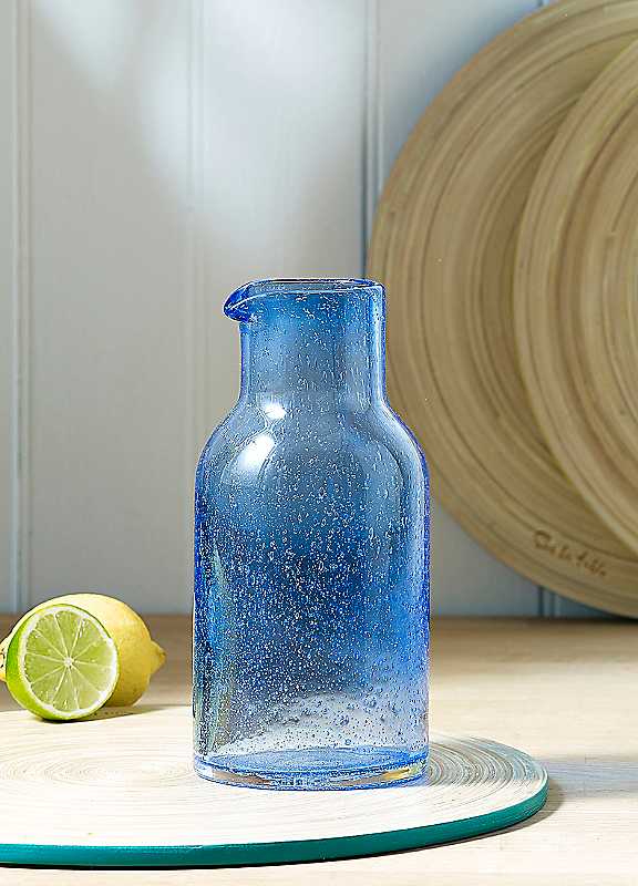 Pairing timeless shape with vibrant colour, the Sur La Table's Colour Me Happy carafe will bring joy to any table. Designed with bubbles in the glass, the blue carafe is a sparkling welcome accent to any table.Capacity: 1400 mlDishwasher safe100% Soda glassSize approx. 20H x 7.8 cm top dia.