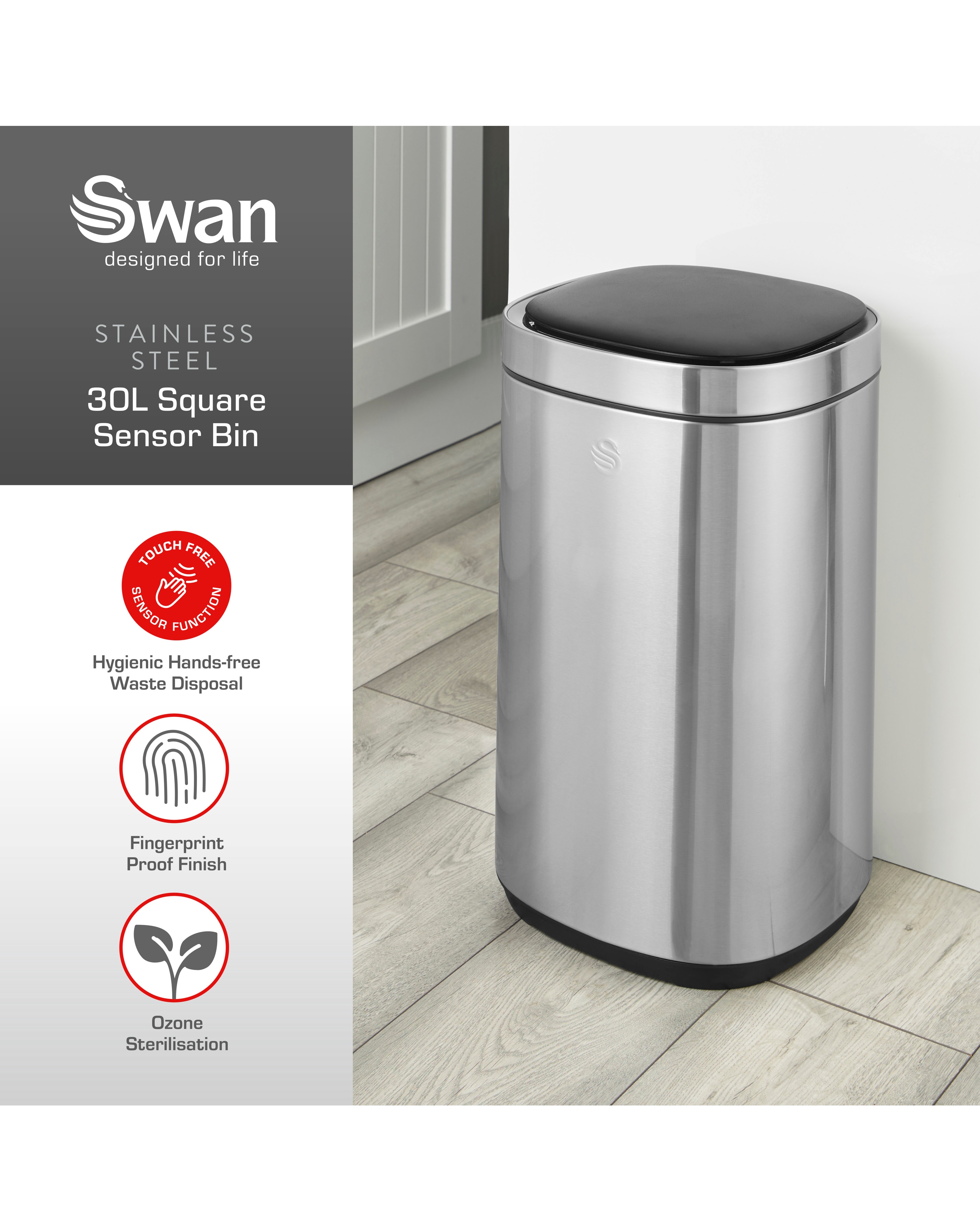 This stylish Swan 30L square kitchen sensor bin makes everyday waste disposal easier than ever. Just approach the bin or swipe near the sensor bar and it opens automatically. The lid closes after 5 seconds of no activity, making it more hygienic than standard bins. Innovative Ozone odour sterilisation reduces bacteria and odours from your bin, filtering out particles to give you fresher air and cleaner environment. Made from high quality stainless steel with fingerprint proof matt finish for durability. The removable retainer ring secures your bin liner into place. The plastic inner bucket is resistant to stains and odours. Needs a simple wipe down with a damp cloth to clean. Requires 6 x AA batteries (Not included). 30L SENSOR BIN. DURABLE, LONG-LASTING DESIGN. OZONE ODOUR STERILISATION - Innovative Ozone odour sterilisation is a fuss-free way to reduce bacteria and odours from your bin. With a simple button press, the ozone cycle filters out particles through the lid, giving you fresher air and cleaner environment. PLASTIC LID & INNER BUCKET - This stainless steel bin features a lightweight plastic lid for added durability and to seal in odours. The plastic inner bucket is resistant to stains and odours, making it easy to clean. It also features a removable retainer ring that keeps the bin liner in place. 5 YEAR GUARANTEE - Assured Swan quality with a 1 year guarantee & optional 4 year extension, subject to product registration online.
