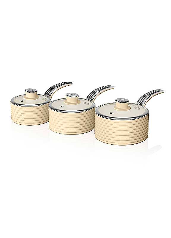 Create delicious home cooked meals for one or all the family with the Retro 3 Piece Saucepan Set. Comprising of 16, 18 and 20cm saucepans, this set is perfect for boiling pasta, potatoes and vegetables with ease, making it perfect for one or all the family.Featuring an ivory ceramic non-stick inner coating, each saucepan requires little to no oil, enabling a healthier cook and an easier clean.Constructed from 3mm thick pressed aluminium, each saucepan is built to stand the test of time whilst Bakelite soft touch stay-cool handles offer comfort and control during use.Suitable for all hob types including induction, each saucepan requires only a simple hand wash to maintain its optimum performance.Complete with glass lids featuring a stylish Swan embossed handle and beautiful rib designed body, this Retro 3 Piece Saucepan Set makes both a practical and stylish addition to your kitchen.Includes 16cm/18cm/20cm saucepansBody heights 8cm/9cm/10cm3mm thick pressed aluminium constructionGlass lids with steam vents & soft touch lid knobsBeautifully rib designed bodiesIvory ceramic non-stick inner coating free from PFOA & PTFEHeat resistant exterior colour coatingBakelite soft touch stay cool handleSuitable for all hobs including induction
